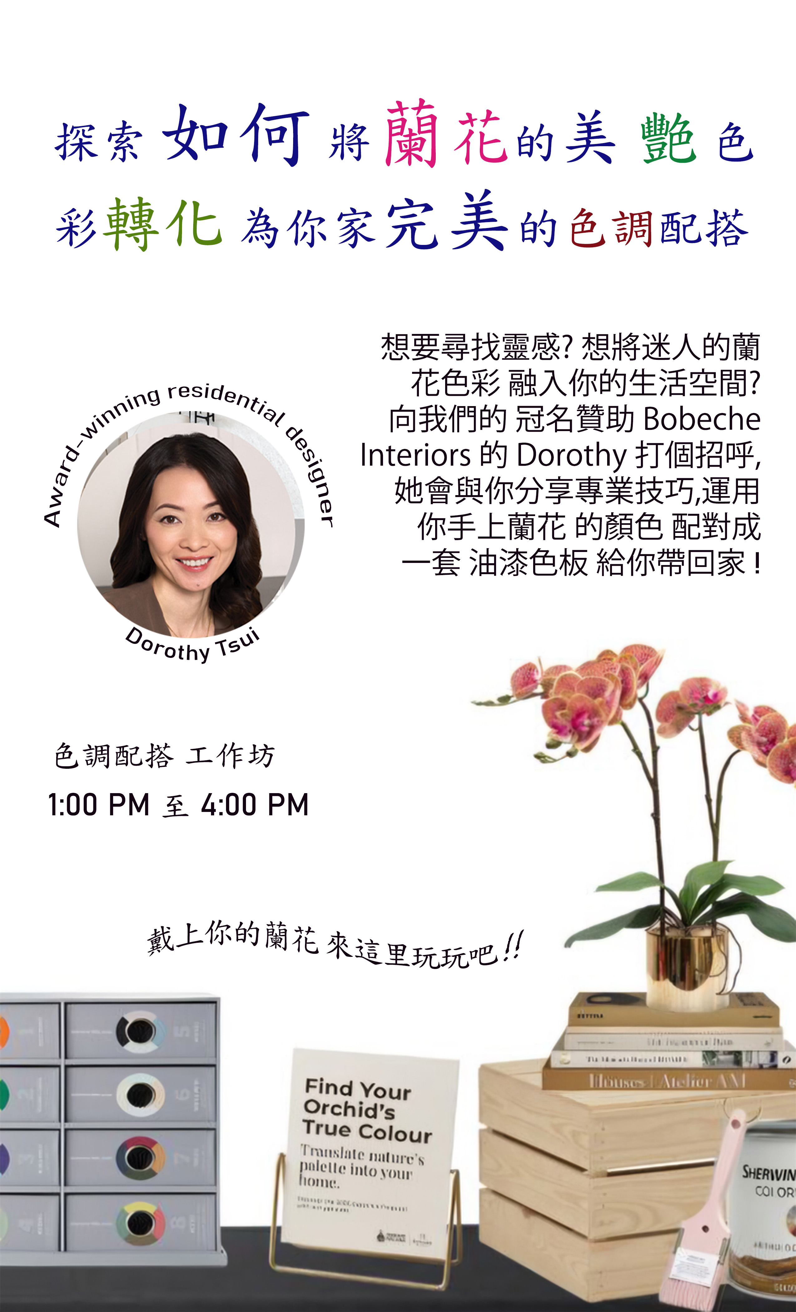 | April 18, Saturday 2:00 PM 國蘭換盆示範 | April 19, Sunday 2:30 PM 室內如何令蘭花開花 | April 18&19,Sat & Sun 1:00PM 色 彩 工 作 坊 |